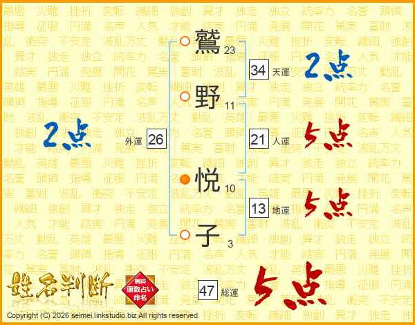 鷲(23画)野(11画) 悦(10画)子(3画)