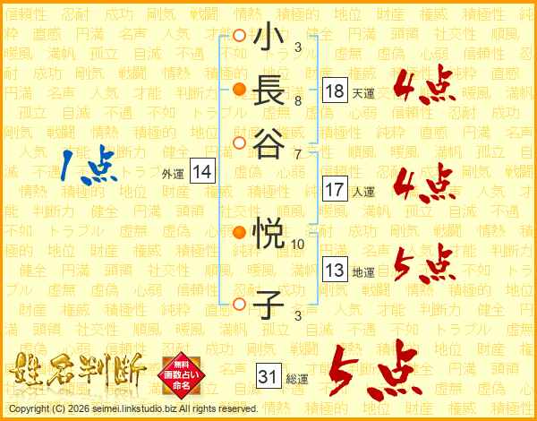 小(3画)長(8画)谷(7画) 悦(10画)子(3画)