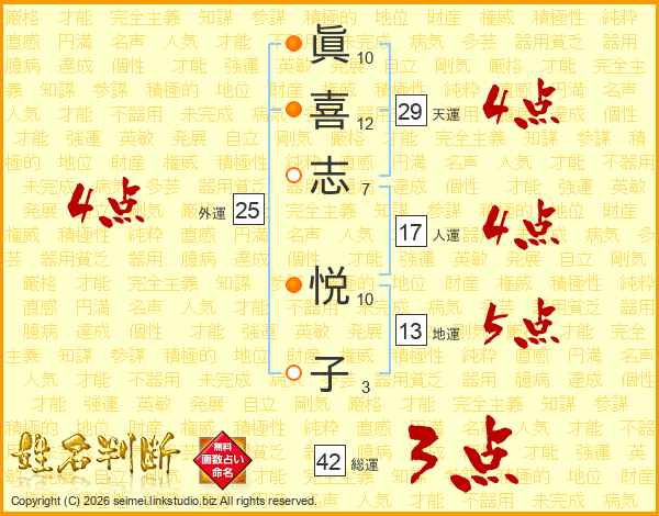 眞(10画)喜(12画)志(7画) 悦(10画)子(3画)