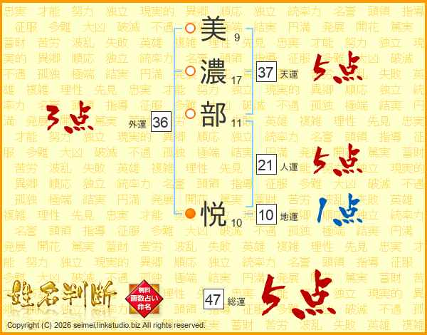 美(9画)濃(17画)部(11画) 悦(10画)