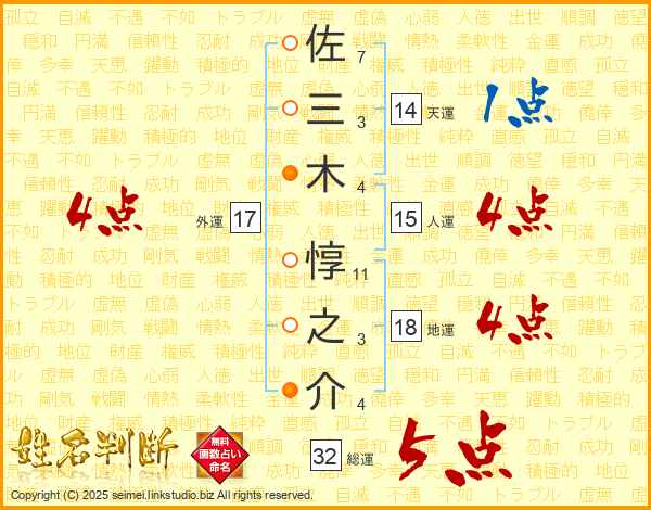 佐(7画)三(3画)木(4画) 惇(11画)之(3画)介(4画)