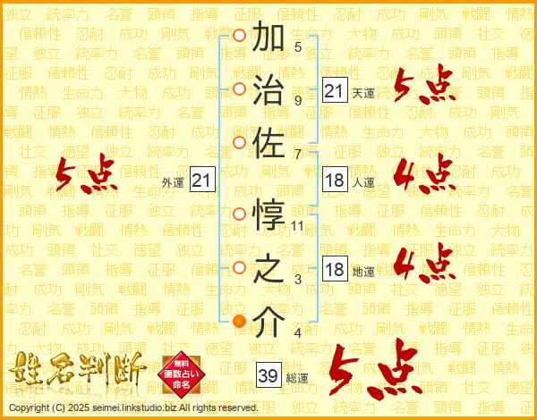 加(5画)治(9画)佐(7画) 惇(11画)之(3画)介(4画)