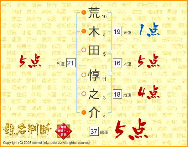 荒木田惇之介さんの総運は37画の5点!