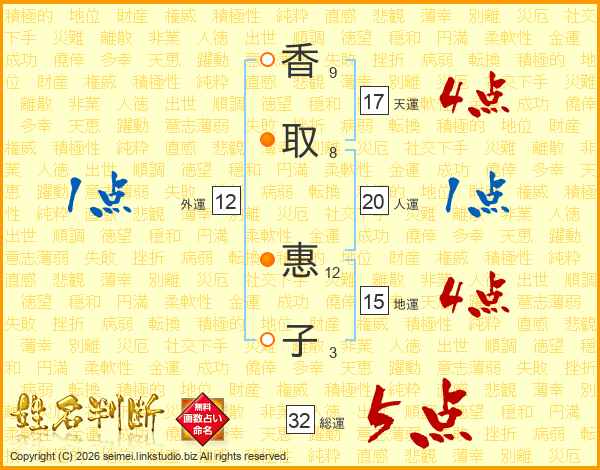 生活面を象徴する運勢です。外部から受ける影響力を表し、結婚運、家庭運や職場、環境への順応性を表します。総運から人運を引いた画数。姓や名が1文字の場合を除く。