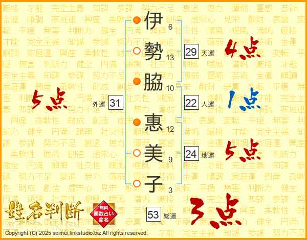 伊(6画)勢(13画)脇(10画) 惠(12画)美(9画)子(3画)