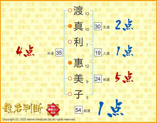 渡(13画)真(10画)利(7画) 惠(12画)美(9画)子(3画)