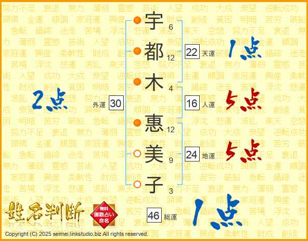 宇(6画)都(12画)木(4画) 惠(12画)美(9画)子(3画)
