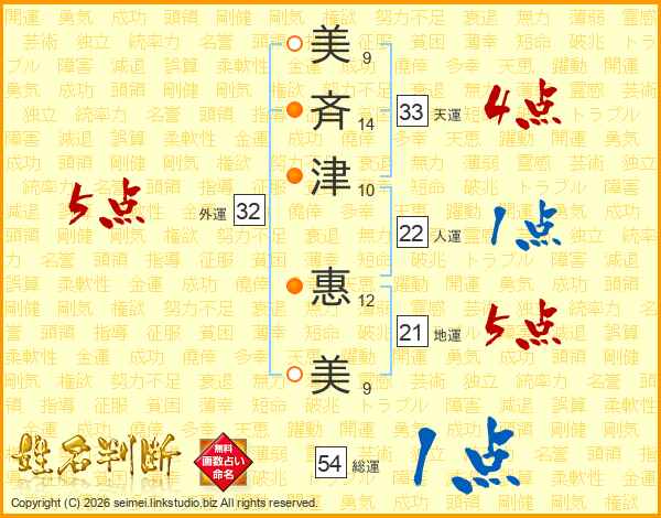美(9画)斉(14画)津(10画) 惠(12画)美(9画)