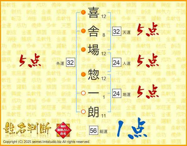 喜(12画)舎(8画)場(12画) 惣(12画)一(1画)朗(11画)