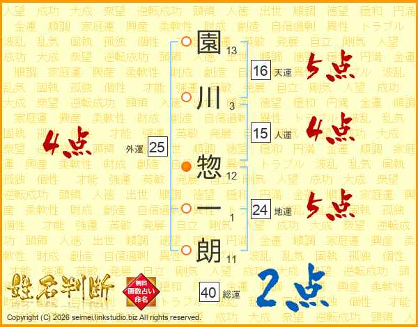 園(13画)川(3画) 惣(12画)一(1画)朗(11画)