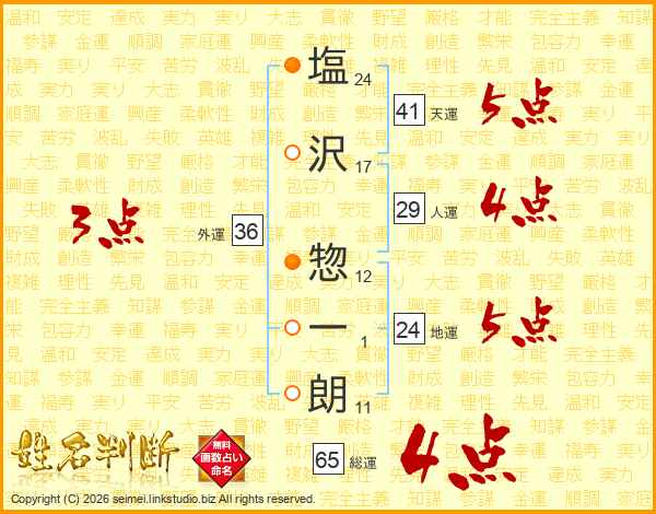 塩(24画)沢(17画) 惣(12画)一(1画)朗(11画)