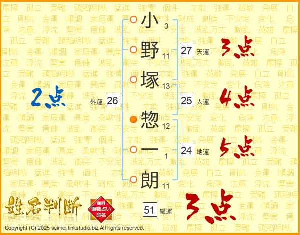 小(3画)野(11画)塚(13画) 惣(12画)一(1画)朗(11画)