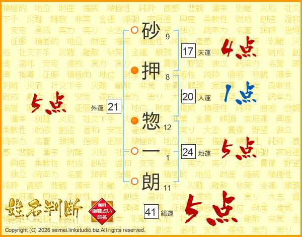 砂(9画)押(8画) 惣(12画)一(1画)朗(11画)