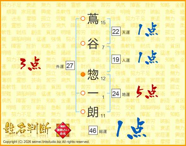 蔦(15画)谷(7画) 惣(12画)一(1画)朗(11画)