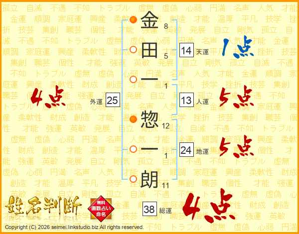 金(8画)田(5画)一(1画) 惣(12画)一(1画)朗(11画)