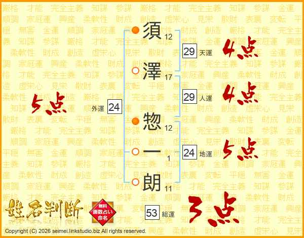 須(12画)澤(17画) 惣(12画)一(1画)朗(11画)