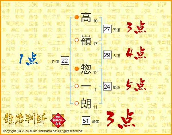 高(10画)嶺(17画) 惣(12画)一(1画)朗(11画)