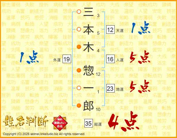 三(3画)本(5画)木(4画) 惣(12画)一(1画)郎(10画)