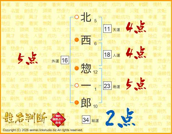 北(5画)西(6画) 惣(12画)一(1画)郎(10画)