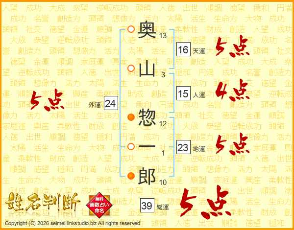 奥(13画)山(3画) 惣(12画)一(1画)郎(10画)