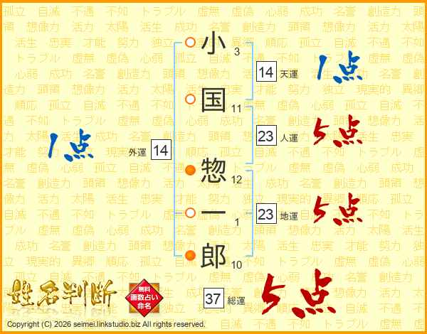 小(3画)国(11画) 惣(12画)一(1画)郎(10画)