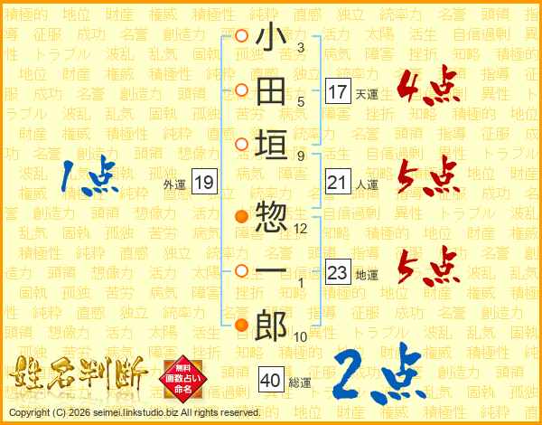 小(3画)田(5画)垣(9画) 惣(12画)一(1画)郎(10画)