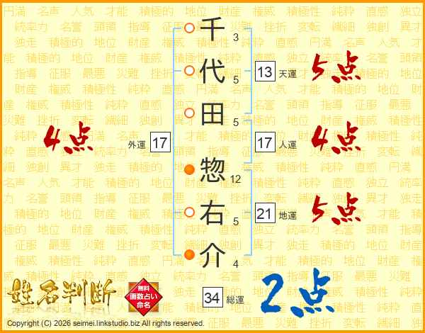 千代田惣右介さんの総運は34画の2点!