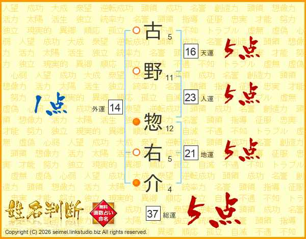 古(5画)野(11画) 惣(12画)右(5画)介(4画)