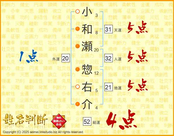 小(3画)和(8画)瀬(20画) 惣(12画)右(5画)介(4画)