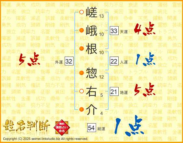 嵯(13画)峨(10画)根(10画) 惣(12画)右(5画)介(4画)