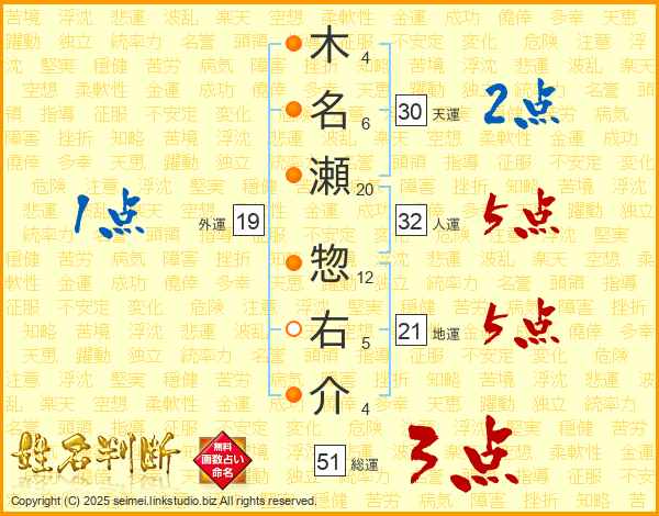 木(4画)名(6画)瀬(20画) 惣(12画)右(5画)介(4画)