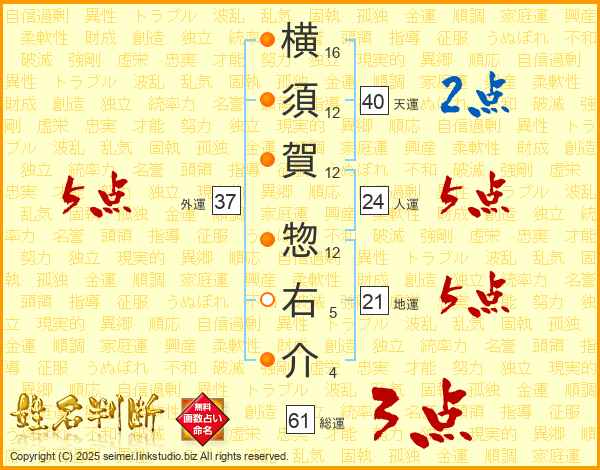 横(16画)須(12画)賀(12画) 惣(12画)右(5画)介(4画)