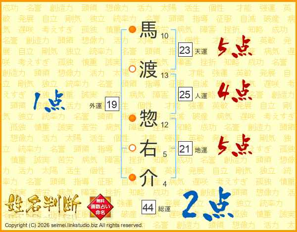 馬(10画)渡(13画) 惣(12画)右(5画)介(4画)