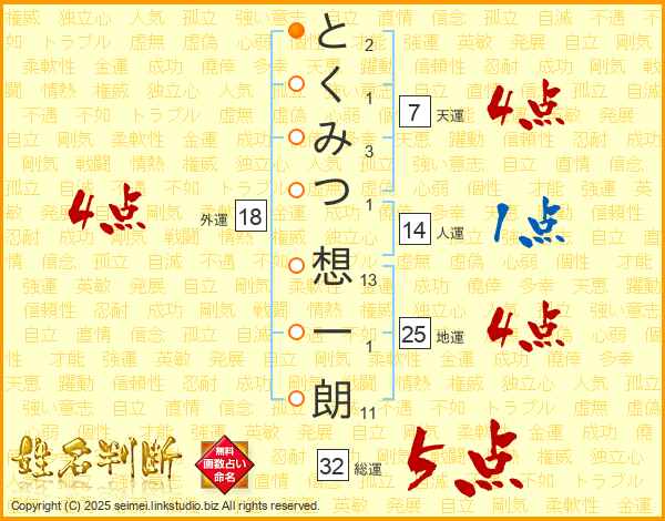 あなたの人生を表す1番重要な運勢です。生涯を通じて影響する総合運となり、主に50歳以降の晩年期に影響を及ぼします。苗字と名前の合計画数。