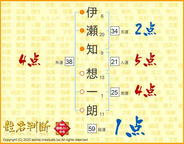 伊(6画)瀬(20画)知(8画) 想(13画)一(1画)朗(11画)