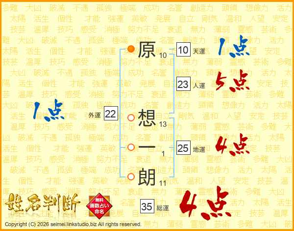 あなたの人生を表す1番重要な運勢です。生涯を通じて影響する総合運となり、主に50歳以降の晩年期に影響を及ぼします。苗字と名前の合計画数。