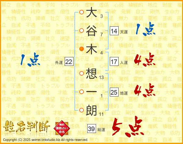 大(3画)谷(7画)木(4画) 想(13画)一(1画)朗(11画)