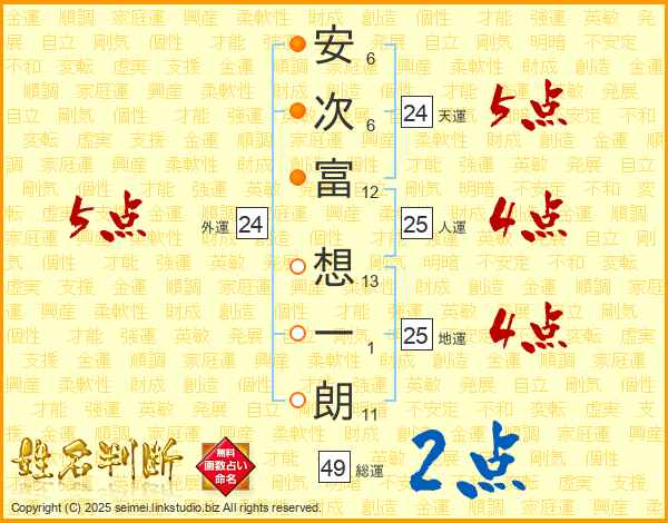 安(6画)次(6画)富(12画) 想(13画)一(1画)朗(11画)