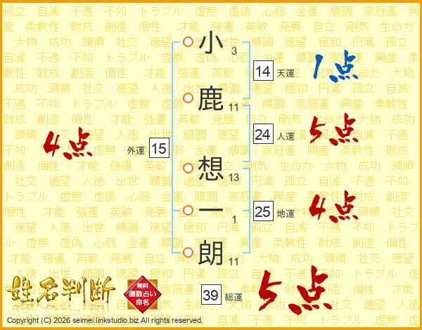 小(3画)鹿(11画) 想(13画)一(1画)朗(11画)