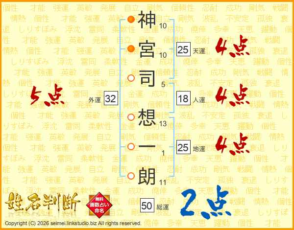 神(10画)宮(10画)司(5画) 想(13画)一(1画)朗(11画)