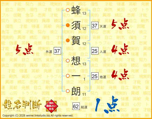 蜂(13画)須(12画)賀(12画) 想(13画)一(1画)朗(11画)