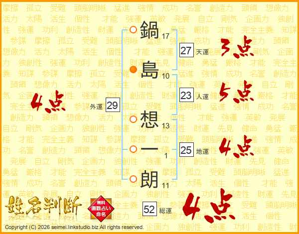 鍋(17画)島(10画) 想(13画)一(1画)朗(11画)