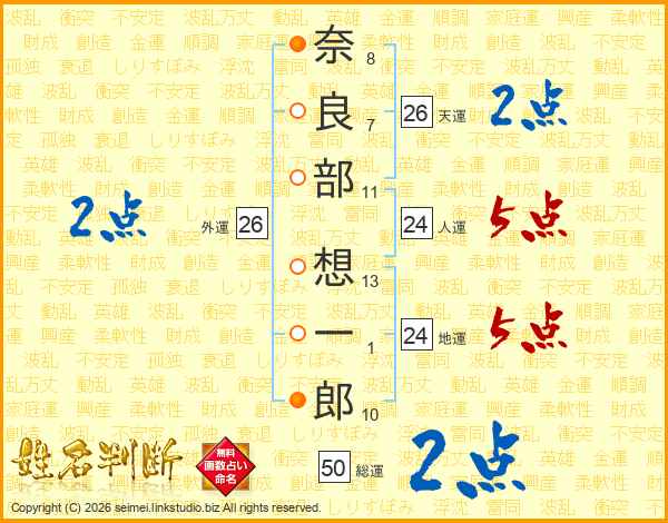 奈(8画)良(7画)部(11画) 想(13画)一(1画)郎(10画)