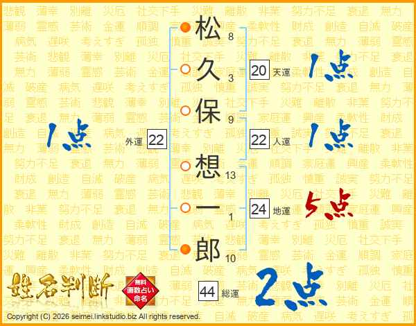 松(8画)久(3画)保(9画) 想(13画)一(1画)郎(10画)