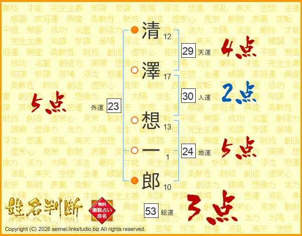 清(12画)澤(17画) 想(13画)一(1画)郎(10画)