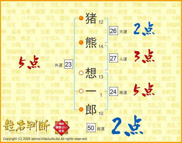 猪(12画)熊(14画) 想(13画)一(1画)郎(10画)