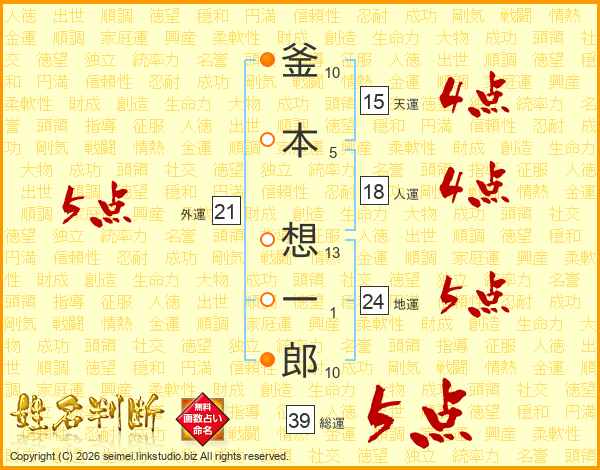 釜(10画)本(5画) 想(13画)一(1画)郎(10画)
