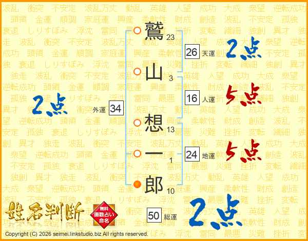 鷲(23画)山(3画) 想(13画)一(1画)郎(10画)