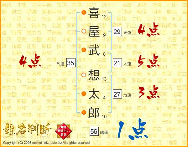 喜(12画)屋(9画)武(8画) 想(13画)太(4画)郎(10画)