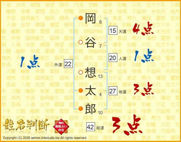 岡(8画)谷(7画) 想(13画)太(4画)郎(10画)